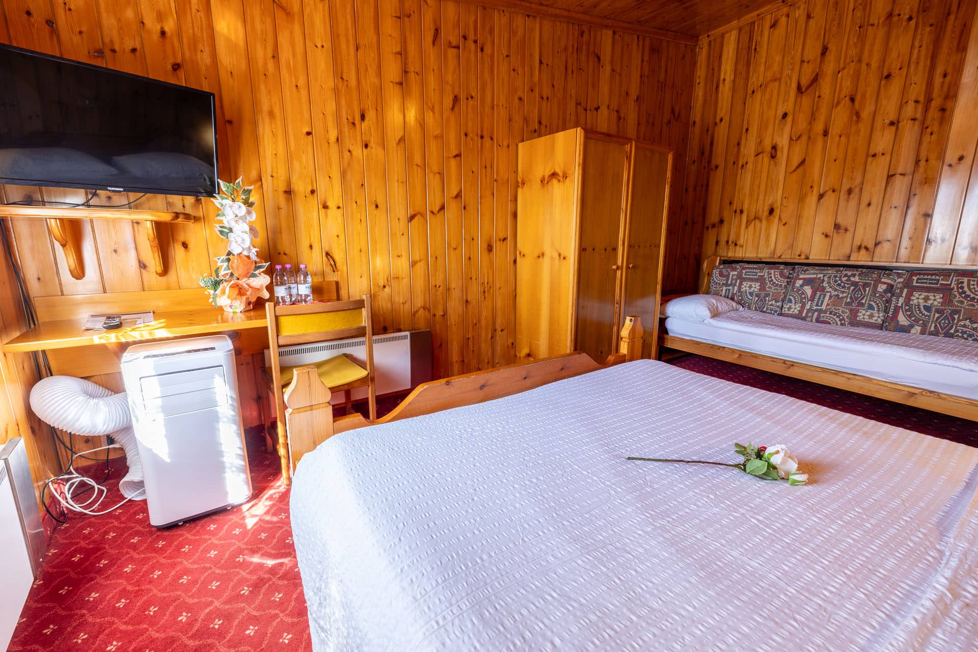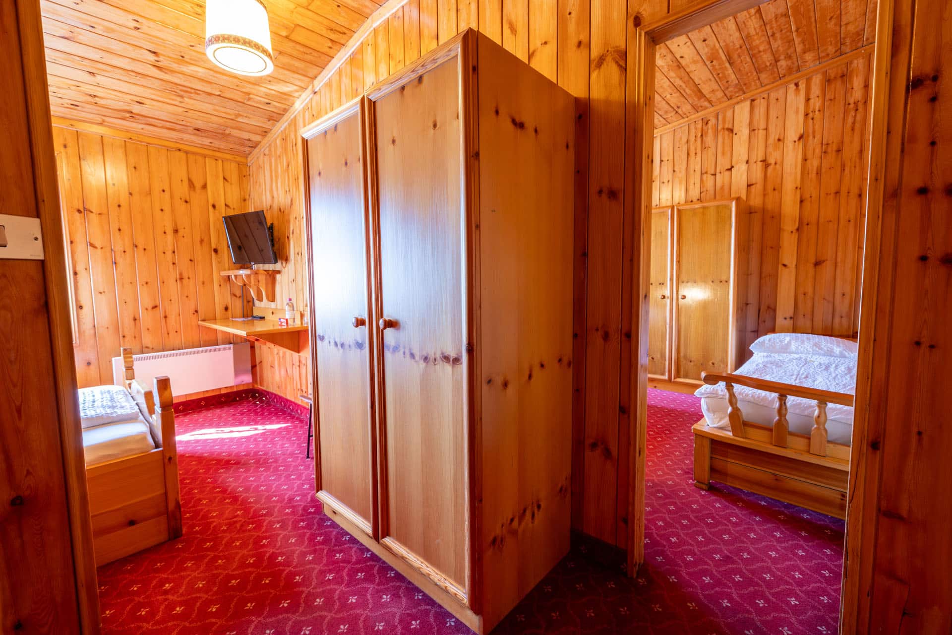 Camera mansardata a due vani, in stile alpino rivestita in perline con TV LCD satellitare. Si rivolge verso sud e lato interno, garantendo tranquillità. A disposizione un bagno privato con asciugacapelli e set di cortesia, asciugamani e lenzuola.