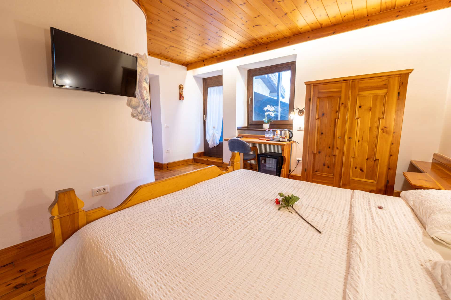 Camera rinfrescate in stile alpino con TV LCD e pareti dipinde a mano dall’artista locale Rita Savino.